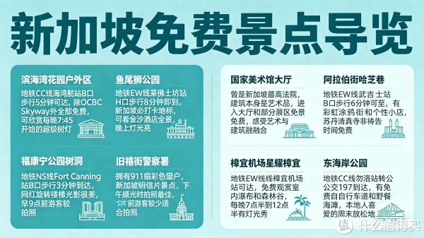 鱼尾狮公园:乘坐地铁 EW 线到莱佛士坊站 H 口,步行 8 分钟即到。这里是新加坡必打卡地标,可看金沙酒店全景,晚上灯光亮起时景色更震撼,且全天免费开放。
